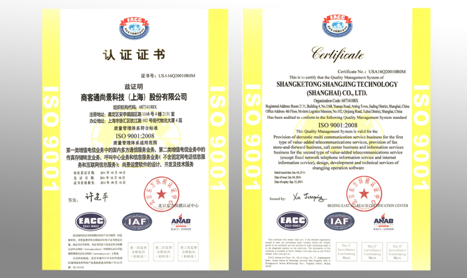 2015年12月21日至23日,北京东方纵横认证中心审核小组,对商客通尚景科技(上海)股份有限公司进行了ISO9001质量管理体系的再次认证审核。经过严格审核后,尚景荣获了新的质量管理体系认证证书(证书编号:USA16Q20010R0M)。