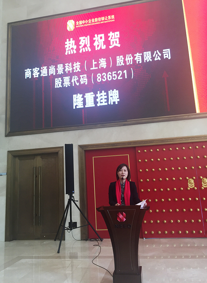 2016年4月28日,全国中小企业股份转让系统(新三板)在北京举行挂牌仪式;商客通尚景科技(上海)股份有限公司(股票名称:商客通,股票代码:836521)成功挂牌,迈开了在资本市场的第一步。商客通(股票代码:836521)总裁李东,高级副总裁孙涛、黄锋等参加了挂牌仪式,共同见证这一重要历史时刻。